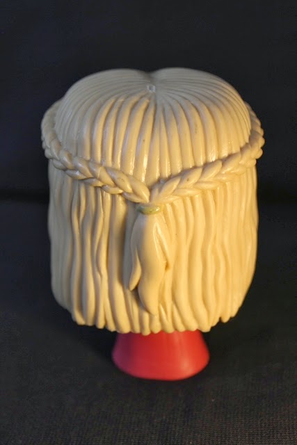 This Funko is wearing one of Cersei's iconic dressed in the Lannister red and gold. It's cinched at the waist with a two-tiered belt and her billowing sleeves are trimmed in the same colour. Her hands rest on her hips. The dress itself is a simple v-neck but has some beautiful gold detailing around the collar and sleeves. Cersei is also wearing a gold ring on each hand and a gold medallion around her neck. The painting is pretty good on this one, though her dress bleeds into her hands, and I've managed to chip her nose. I was elated that, unlike the Dany figure in wave #1, Cersei stands up perfectly well. Instead of feet, she balances on the pooling of her dress, and it counterbalances the weight of her head nicely.